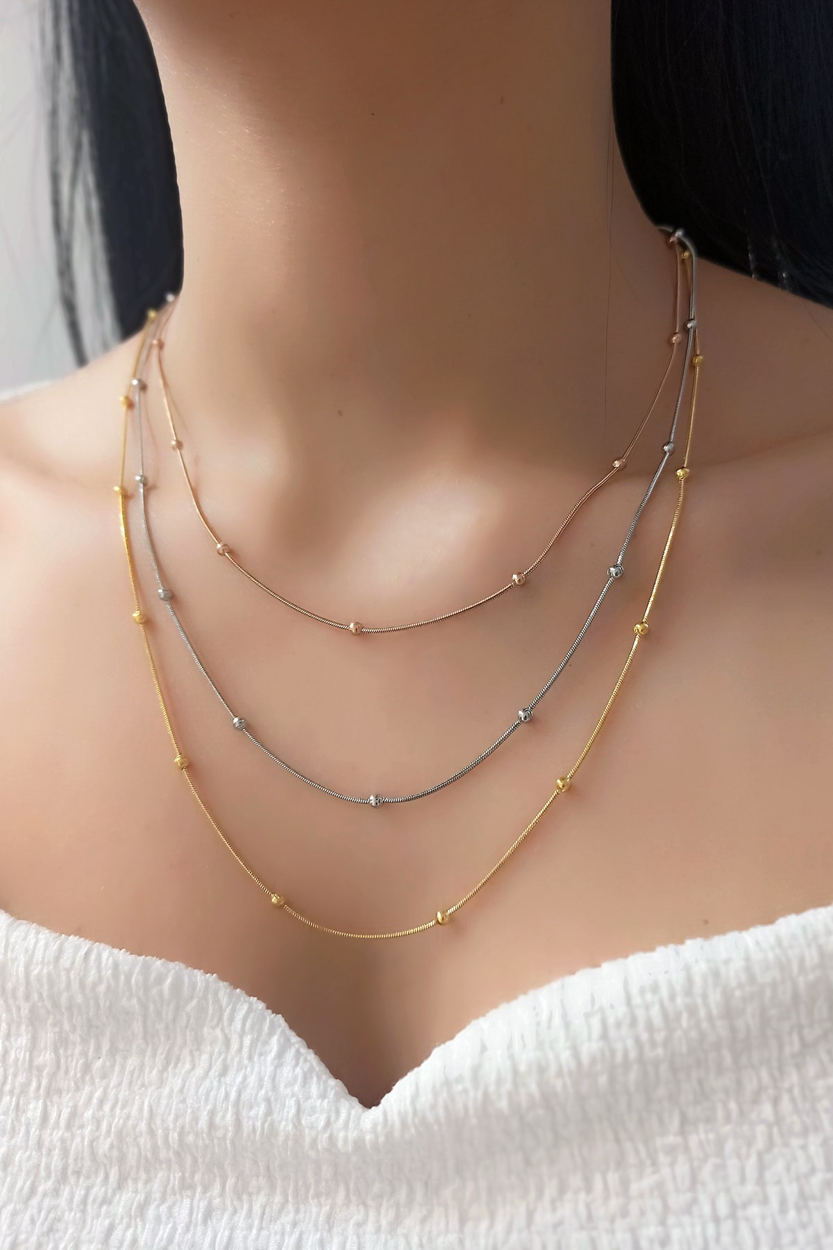Çelik 3 lü Minik Top Zincir Bayan Çelik Kolye TrKolye5416 B310003 (TRKOLYE5416)